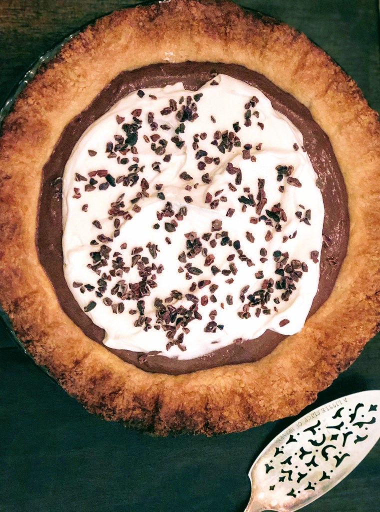 For the whipped cream portion of the pie, I decided to skip the direction and go directly to making my own based off of the method I know is tried and true – heavy cream in a stand mixer. But, I didn’t add enough sugar and forgot the vanilla. It was a very bland cream top, but it worked out! The pudding was so sweet that a very sweet whipped cream would have been an overwhelming amount of sugar. I also skipped dusting cocoa powder and went for scattering cocoa nibs across the top instead. Why? Because I like the crunch the nibs add to the silky smooth texture of the pudding and cream.