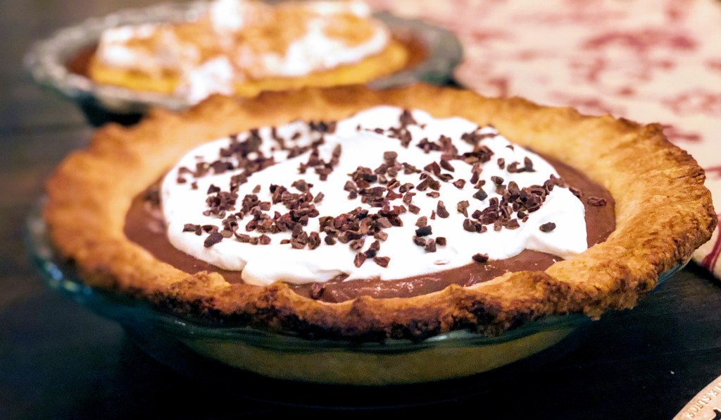 A dazzling chocolate pudding pie cloaked in voluminous whipped cream.