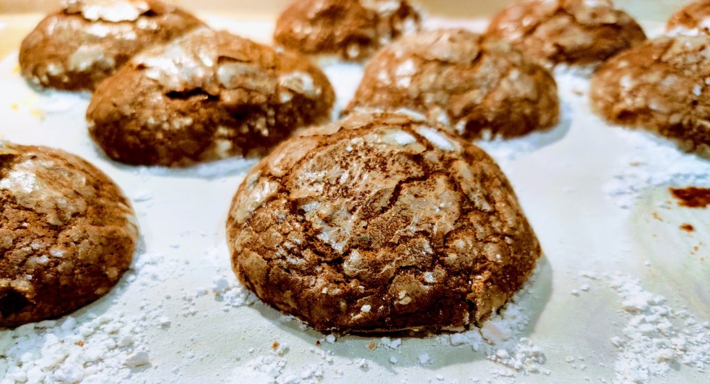 In the end, the cookies lacked sweetness, were cakey, and didn’t hold the cracked powdered sugar form. Needless to say while I failed this time, I plan to test the recipe again, and actually stick to the recipe.