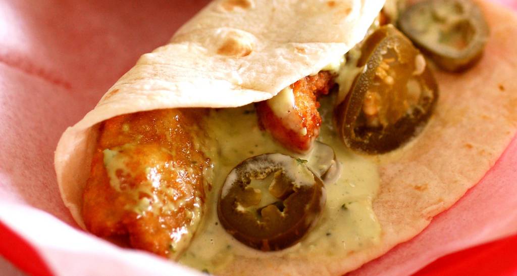 Heat the tortillas for 20 seconds in the microwave. Top each tortilla with two pieces of fish and 1 tablespoon of the poblano tartar sauce. Garnish with sliced pickled jalapeños and serve immediately.