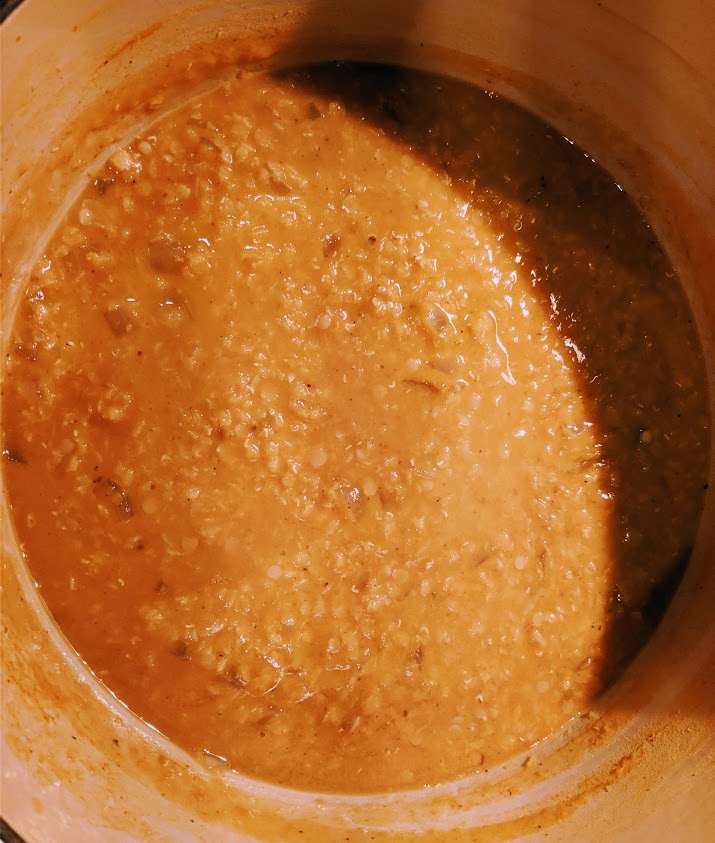 Next I added the tomato paste, which is an amazing component for adding umami flavor in vegan or vegetarian dishes. I then moved through the rest of steps and got the water simmering perfectly for the 15 minutes the lentils need to cook and thicken up the soup. Once 15 minutes were up, the lentils had bloomed beautifully and I whisked for 30 seconds (ish) to get the best texture.