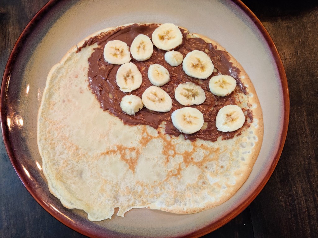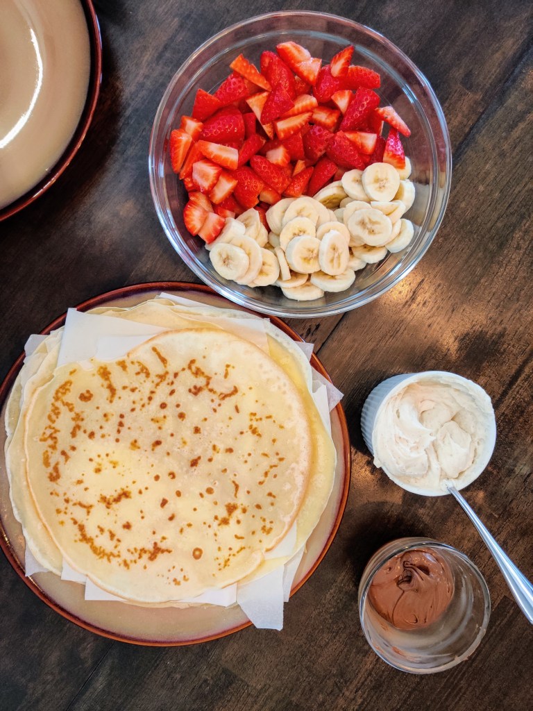 For this example, I made universal crepes. (These are the two my husband loves) I made plain crepes with strawberries and vanilla bean mascarpone, as well as the tried and true nutella and bananas crepe.