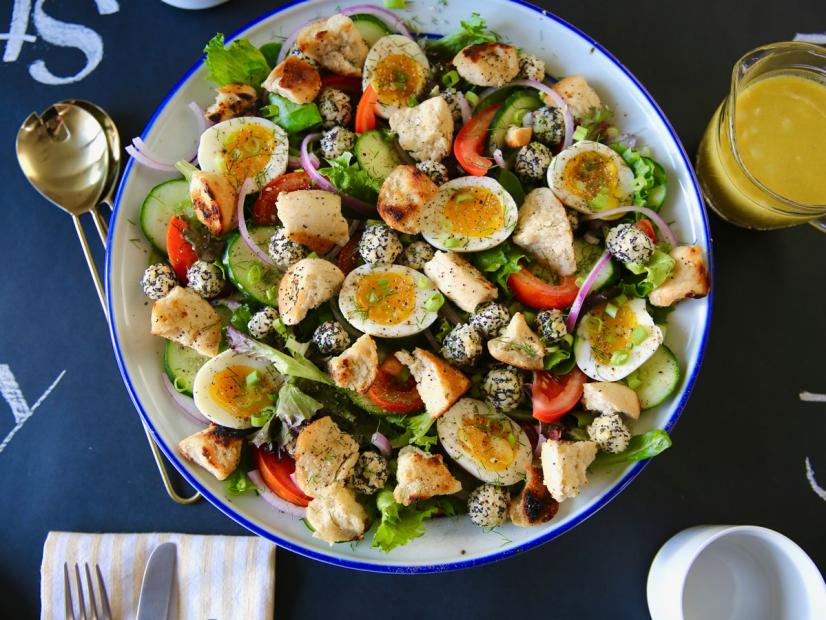 On a serving plate, arrange the mixed greens. Top with the tomatoes, cucumbers, red onions, bagel croutons, cream cheese balls, eggs, scallions, dill, a few pinches of salt and a few turns of pepper. Drizzle with the dressing.