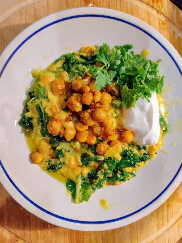 “Spiced chickpeas are crisped in olive oil, then simmered in a garlicky coconut milk for an insanely creamy, basically-good-for-you stew that evokes South Indian chana and some stews found in parts of the Caribbean.”