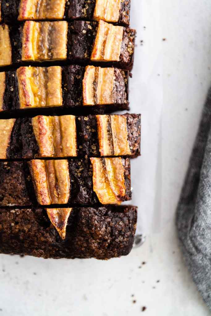 - Pour and spread batter into prepared loaf pan. Slice remaining banana lengthwise into 3 even-size planks, then place on top of loaf; press down gently. Sprinkle with demerara sugar, if desired.