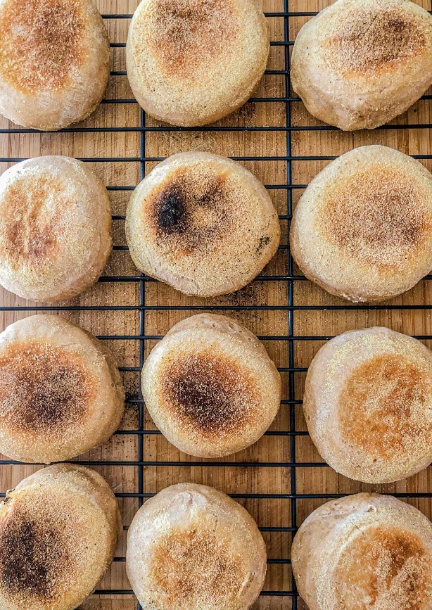 I have been meaning to restart a sourdough starters for a couple of years now and thanks to quarantine, I immediately hopped to it. The second week of my sourdough, some strange things started happening, but by the end of the week it was smelling beautiful, rising, and getting very airy. I am so pleased with my starter now. Having to feed it every day means discarding a lot every week. I started looking to King Arthur for discard recipes and found this awesome recipe for English muffins. What an easy and awesome recipe.