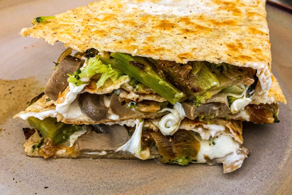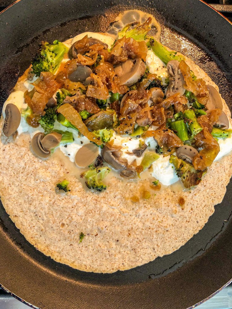 Once the onions are caramelized, it’s time to assemble! Heat a skillet to medium heat, and pour a small amount of olive oil in the pan (this is to brown the tortilla wrap). Add the wrap to the pan, followed by strips of mozzarella. Next, top the cheese with the broccoli, mushrooms, and onion. Add a few cracks of pepper and let heat up until the wrap is getting browned on bottom. Then fold over, leave on the heat for 1-2 more minutes, and remove from skillet.