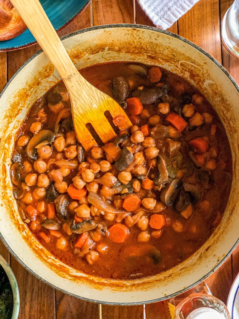 Once simmering, either cover tightly with a lid or pour into your baking dish and cover with a lid or tightly with foil and transfer to oven. Braise chickpeas and vegetables for 90 minutes, checking at the 1 hour mark to make sure the chickpeas haven’t absorbed all of the broth (and adding the remaining 1 cup broth if so). Remove from oven, discard bay leaf, and adjust seasonings to taste.