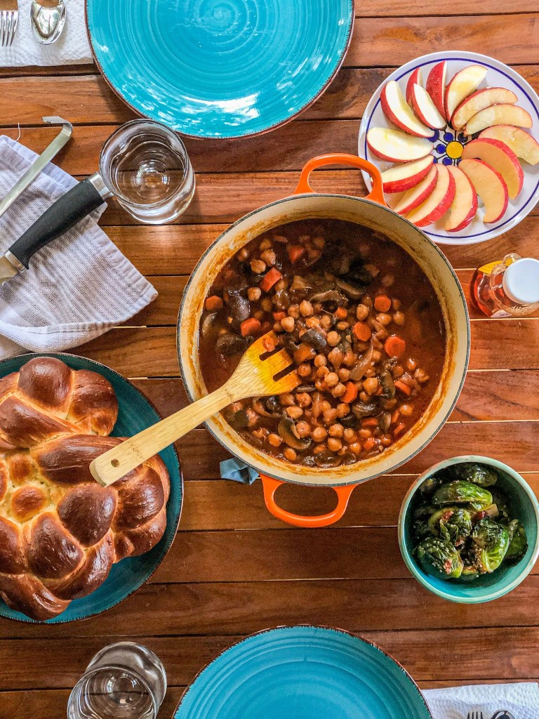 I made a full Rosh Hashanah meal for two this year (because covid), and was thrilled with the results! The spread included an apple with drizzled honey, a Challah loaf, siracha-honey roasted brussels sprouts and Smitten Kitchen’s Tangy Braised Chickpeas. Everything was irresistibly good, but the Tangy Braised Chickpea entrée STOLE. THE. SHOW. I’ve always been a fan of chickpeas, and I consider myself to be a flexitarian, so when I cam across this recipe I was immediately drawn to this dish. I couldn’t wait to make it for Rosh Hashanah.