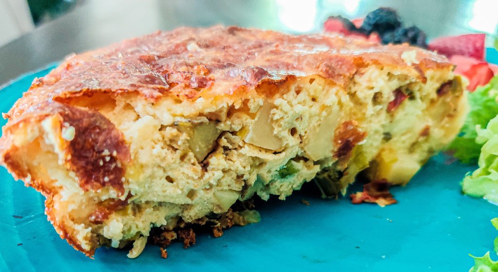 One of the mornings he made a frittata with a side of fresh artisan bread (with jam) and a small salad. It was truly delicious and wholesome. So, in his honor, I decided to make a frittata, side salad, and some fruit for breakfast.