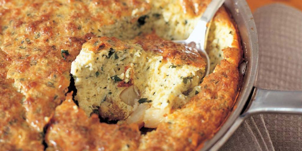 Pour the egg mixture over the potatoes and place the pan in the center of the oven. Bake the frittata until it is browned and puffed, 50 minutes to an hour. It will be rounded and firm in the middle and a knife inserted in the frittata should come out clean. Serve hot.