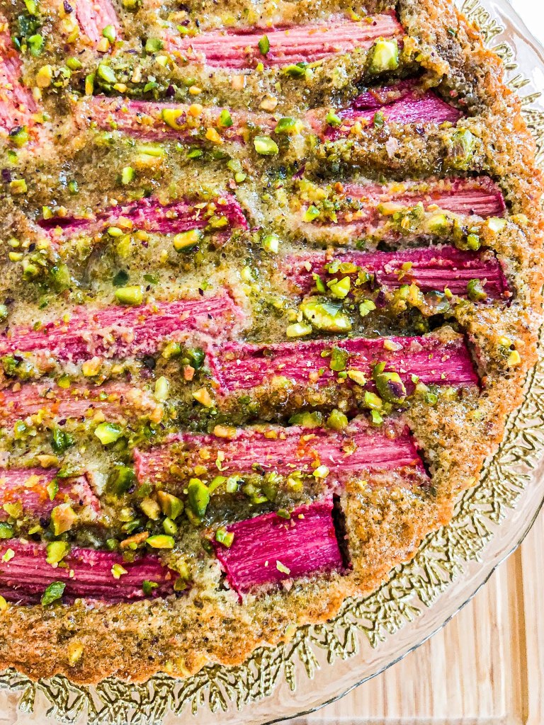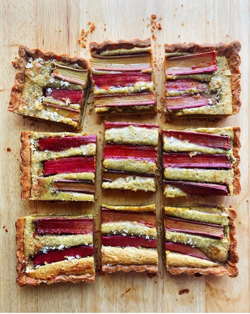 On the left is Sarah Jampel’s Rhubarb Pistachio Frangipane and Cornmeal Tart Crust, and on the right is Shelby’s Rhubarb Pistachio Frangipane Tart!